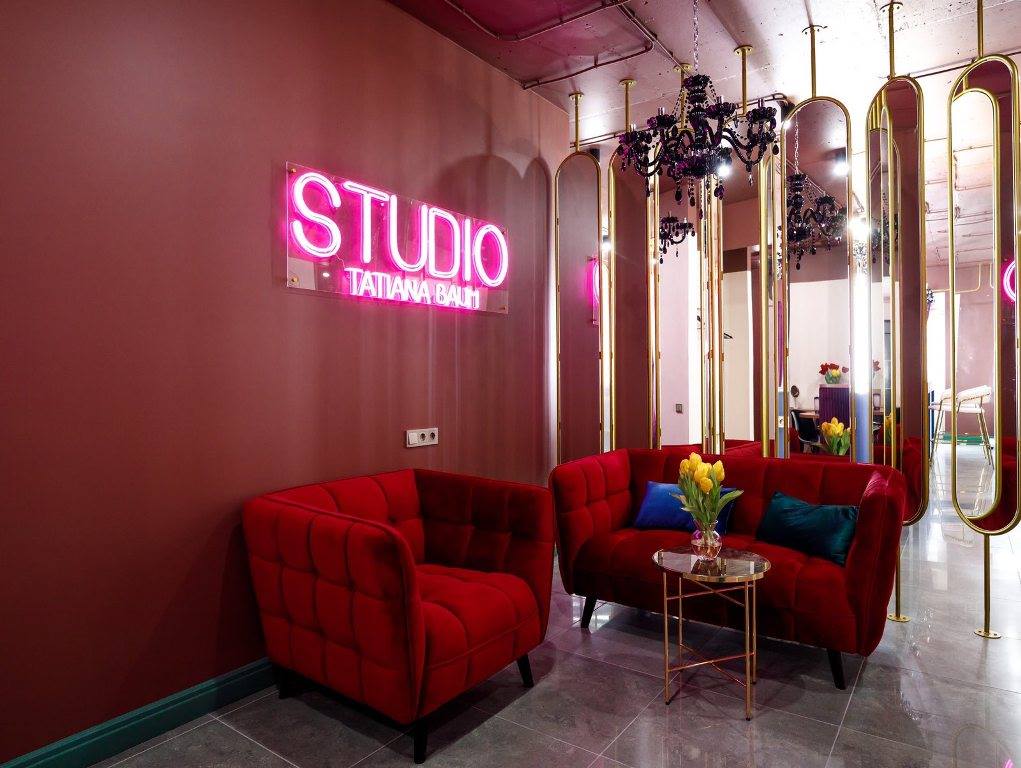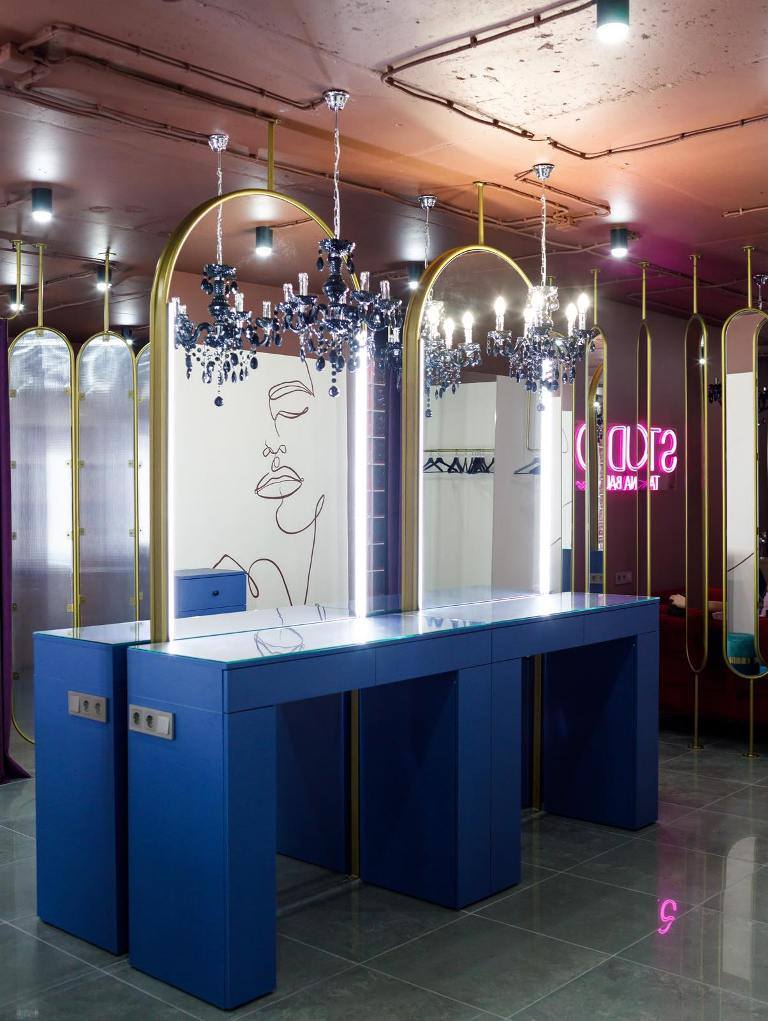 Конструкции и мебель в салоне была выполнена на заказ с учетом последних дизайнерских трендов. Проект продуман дизайнерами, мебель удобна в использовании и в работе. В салоне много зеркал, а так же фишкой декора являются розовые стеклоблоки. Цвет студии - розовый/золотой/зелёный.