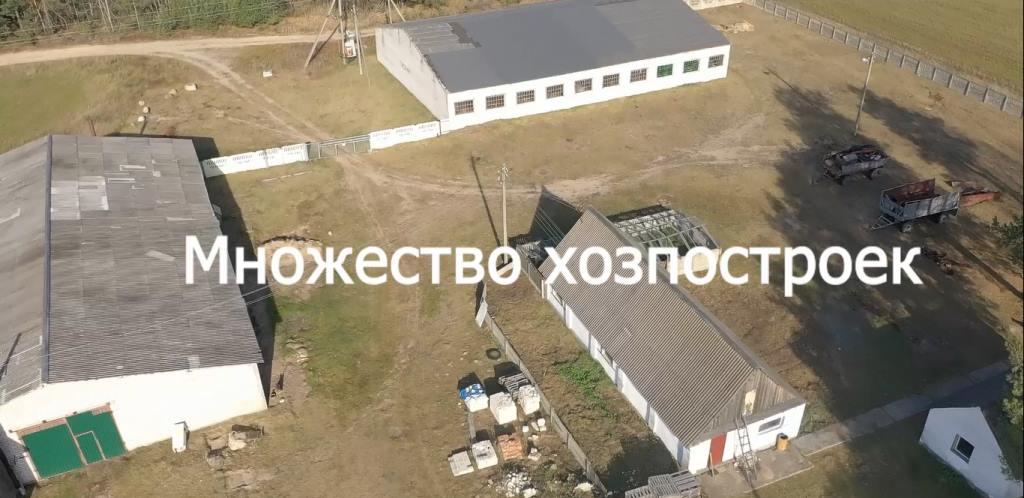 2 га земли в пожизненном пользовании. На территории водоем и множество построек. Ферма 600 м2 использовалась для молочного стада. Рядом в пристройке установлен паровой котел для пропарки заборных плит. Гараж для хранения и ремонта сельхоз техники 600 м2. Здание для размещения 10 свиноматок с приплодом. 2 домика для работающего персонала по 40 м2 каждый. Установлена подстанция мощностью 110 КВТ. Колодец. Сенохранилище площадью 300 м2.
