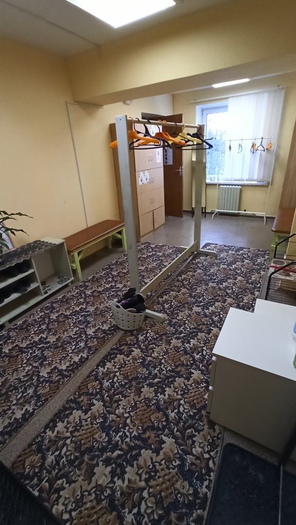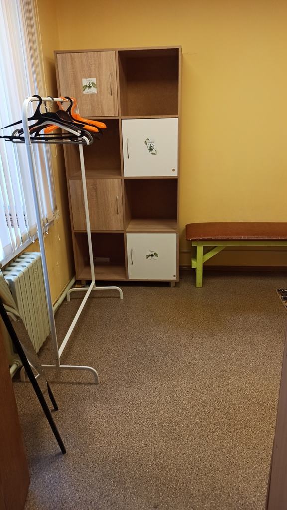 В раздевалке имеются лавочки, шкафы для хранения, зеркало, стойки для одежды и обуви, в тренерской - шкаф, ширма, стол и стулья.