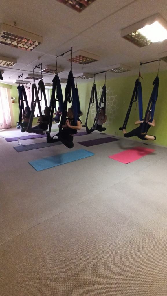 О оснащен гамаками, петлями trx, гантелями, блоками, ремешками и ковриками для занятий йогой. Имеется балкон, стеллажи и шкафы для хранения оборудования, колонка, робот пылесос, куллер.