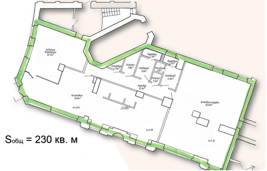 Помещение площадью 231 м2. Высота потолков - 4 метра, панорамные окна. Выполнен ремонт внутри и снаружи.