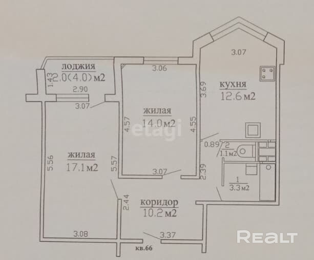 Площадь: общая 58,3; жилая 31,1; кухня 12,6; СНБ 60,3 (кв.м)