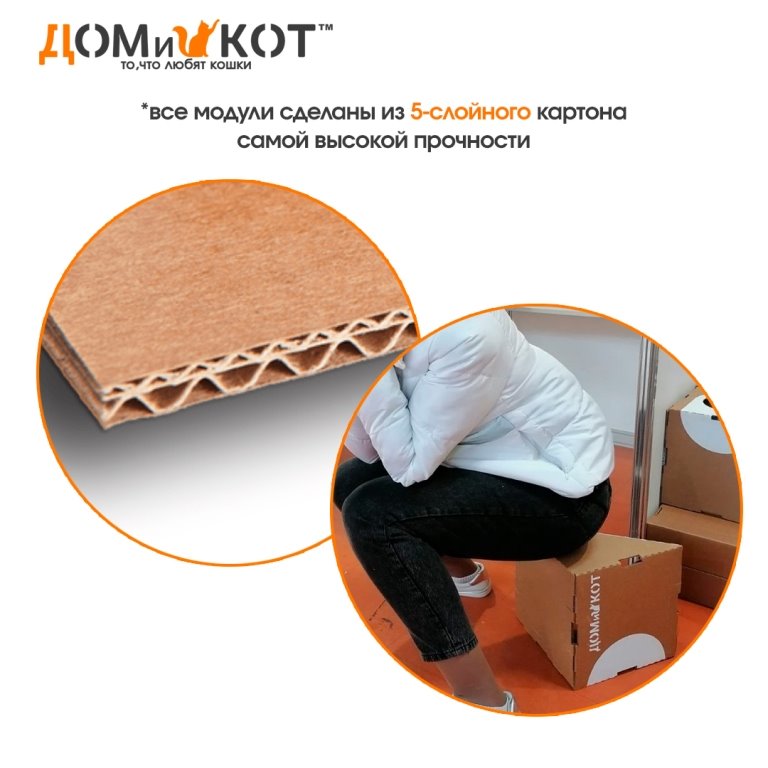 • 5-слойный экологичный картон. Уникальный материал, способный выдержать вес даже самых крупных котов.