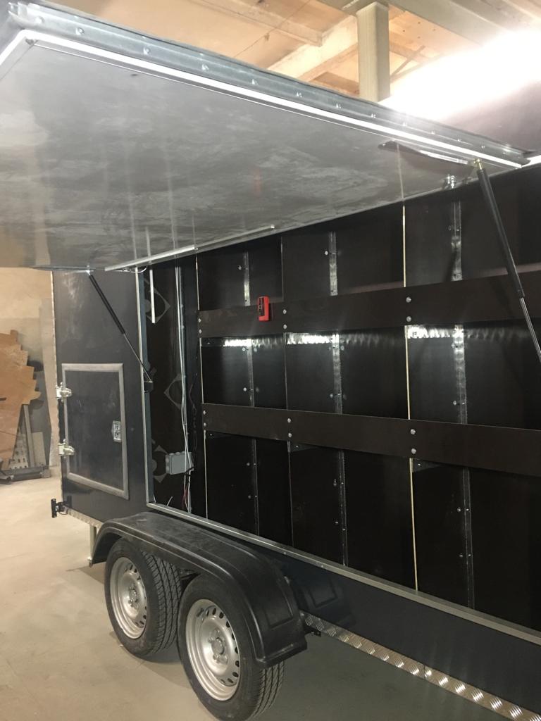 Отсек для принадлежностей - отсек для расположения принадлежностей со встроенными стеллажами согласно чертежу с двух сторон. Выполнен из рифлёного алюминия и алюминиевого уголка, подъемная ставня на газовых упорах размерами 2200-2400 мм, шириной и высотой 1450-1300 мм.