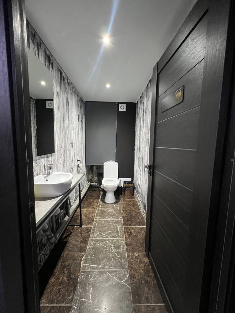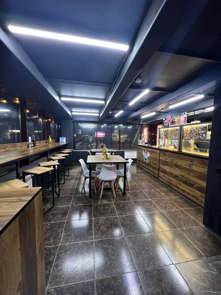 • 1 этаж — современная и уютная посадочная зона на 17 гостей, барная стойка, зона раздачи, санитарная комната. Стильный интерьер в тёмных тонах с комфортной мебелью и продуманным светом создаёт атмосферу уюта.