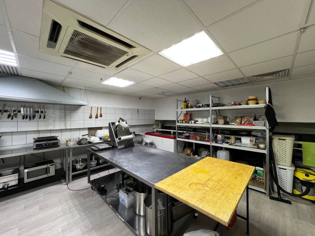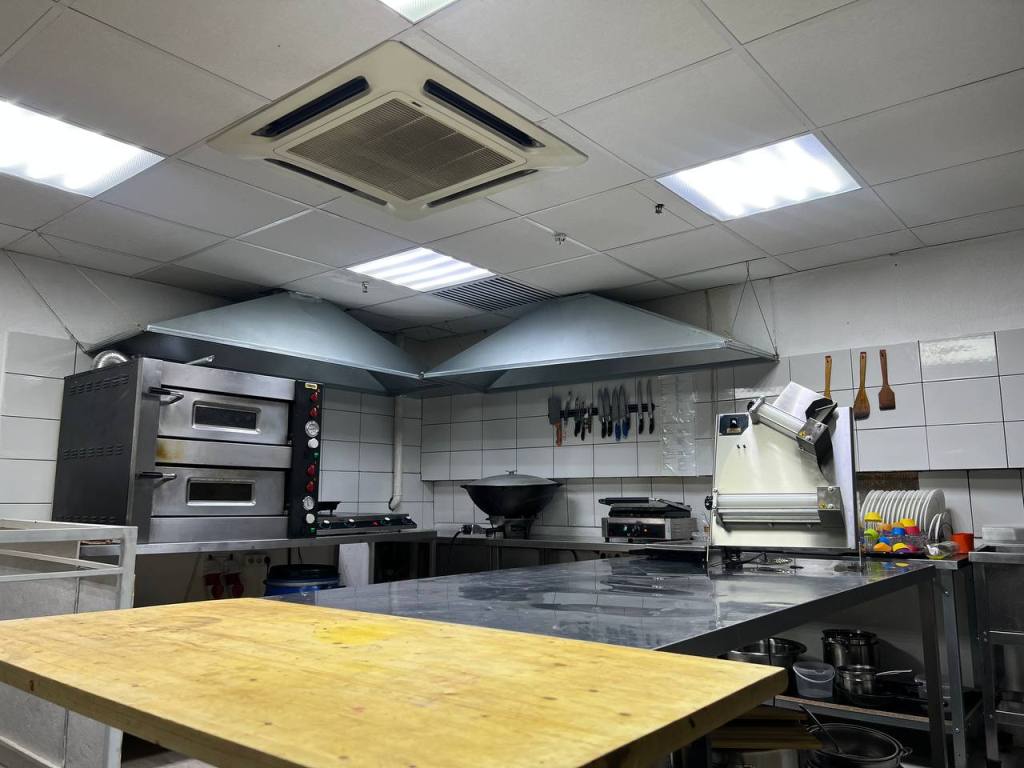 • 2 этаж — просторная кухня с мощной вентиляцией и кондиционером, полностью укомплектованная профессиональным оборудованием: печи, тестораскатка, гриль, холодильники, посуда, ножи, вытяжки, столы из нержавейки и другое.