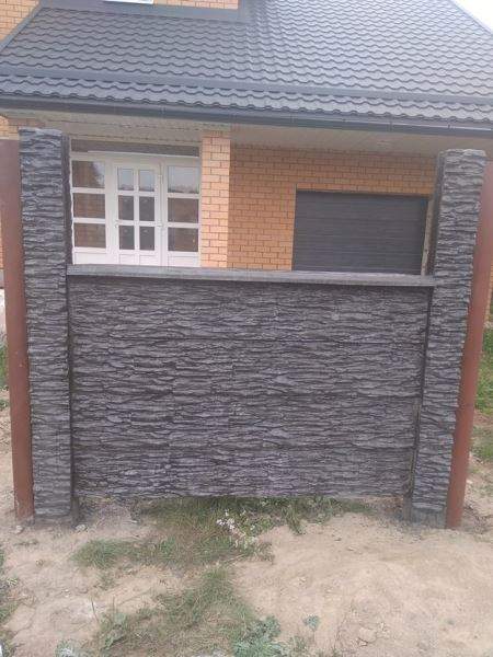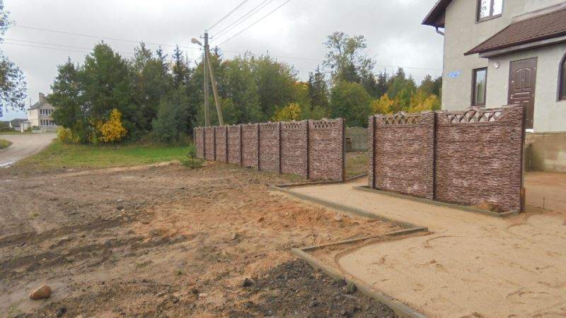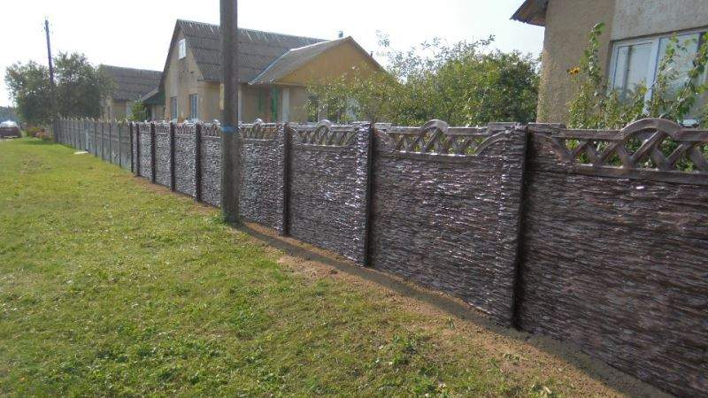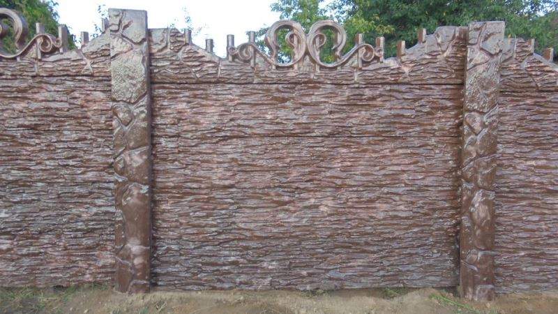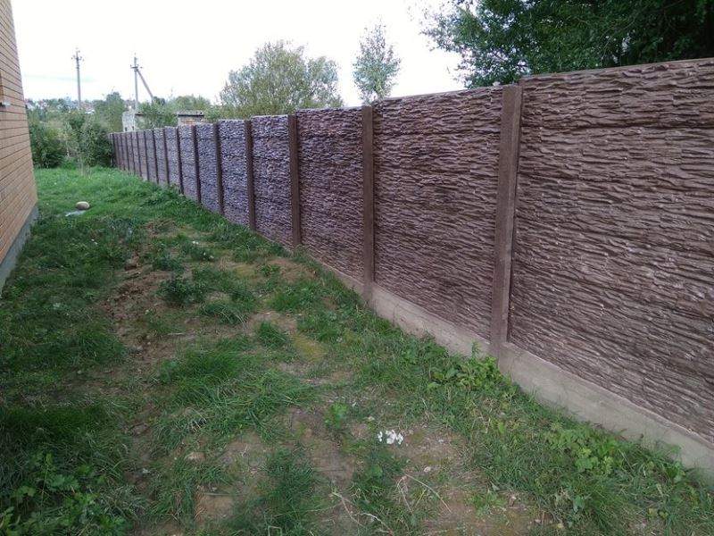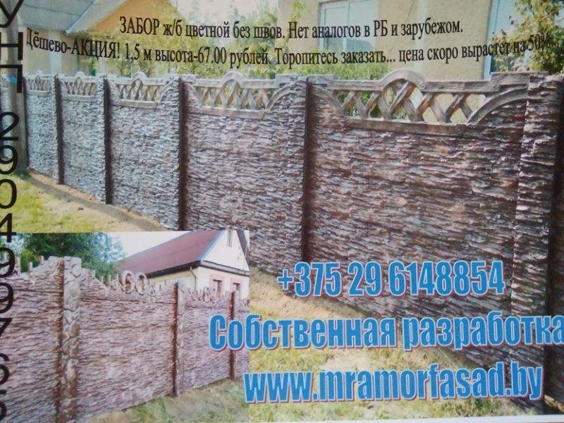 - В-четвёртых, их не надо ежегодно красить как обычные заборы, т.к. они уже прокрашены в общей массе бетона... В целях придания забору ярких насыщенных тонов его лишь покрывают недорогим пропитывающим составом, который подчеркивает цвет и придаёт дополнительный блеск. Данный состав обычно сохраняет свои свойства до семи лет, проверено на нашем опыте.